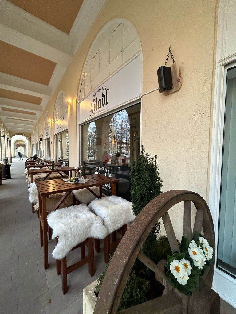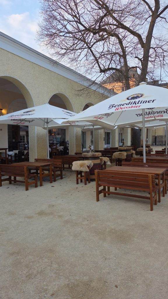 Auch an die Gäste des Kurparks ist gedacht: Unter den Arkaden stehen Tische und Stühle zum Verweilen bereit. Getränke, kleine Snacks sowie Kaffee und Kuchen können im Stadl bestellt werden.